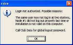 If this is the case, Club Office thinks you're still logged in because you were unable to log out properly. Use the global logout password (see below) to fix it. Note that using the task manager to "end task" to end Club Office can simulate exactly the same situation as a power outage.